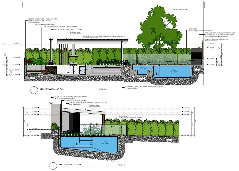 Following resolution of the concept plan, working drawings further refine the projects detail and provide additional information relevant to the construction process and outcomes. Working drawings may include sections/elevation, planting plans, lighting and dimension plans and typically form part of the documentation package for council approval.